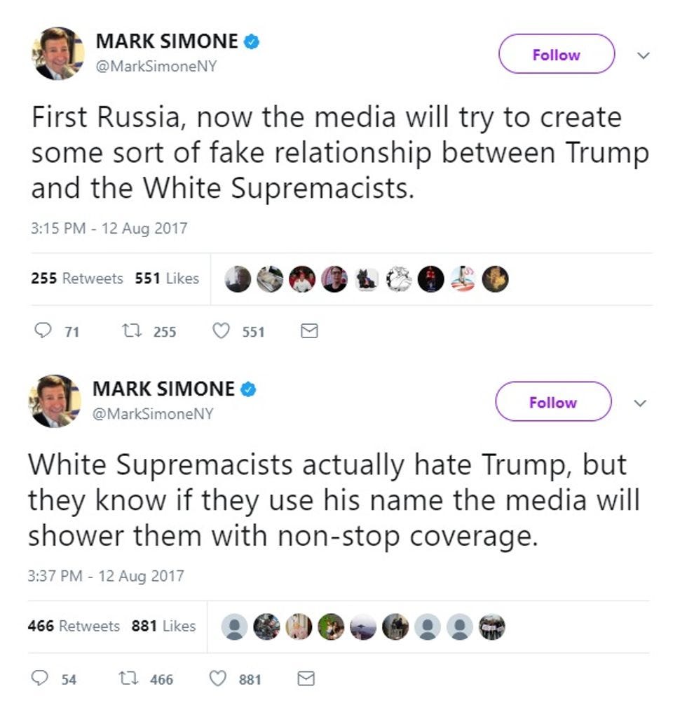 Rightwing radio talker Mark Simone couldn't figure out why anyone would associate shite supremacy with Trump. Must be the media! Also, real white supremacists hate Trump, you know, so ignore the Daily Stormer.