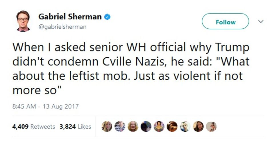 It seems the White House is still getting their ducks in a row on this, however; reporter Gabriel Sherman found someone in the White House who wanted to make clear the counter-protesters probably murdered some people, too: