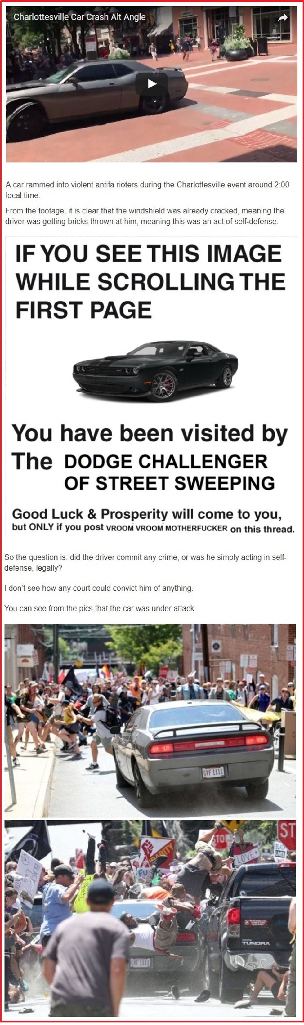 Anglin also had many thoughts on the murder committed when an Ohio man smashed his car into a crowd of people protesting the demonstration. Before the suspect was identified, Anglin decided that obviously the attack had been a matter of self-defense, since, he claimed, the Dodge Challenger's windshield was already broken in the video (based on a still showing the car backing up after the attack -- no comment on the flat tire...).