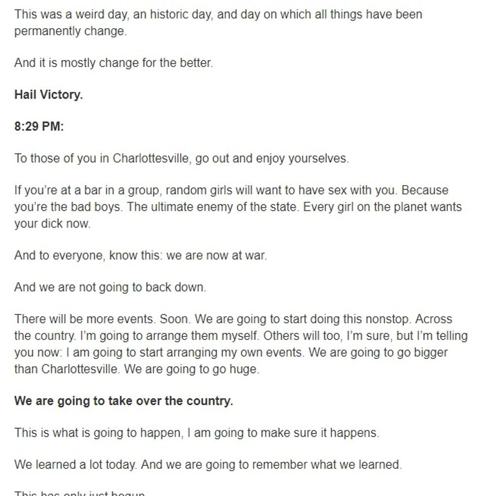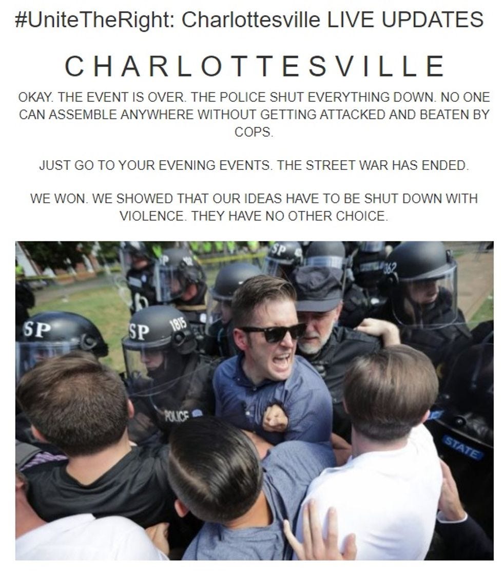 For some real insight into who was happy about yesterday's violence, let's check in with the geniuses at neo-Nazi site The Daily Stormer, where they're celebrating their "victory" after police shut down Saturday's planned "Unite the Right" rally. Because, you see, the white supremacist message is so obviously true that the Powers That Be had to silence it: