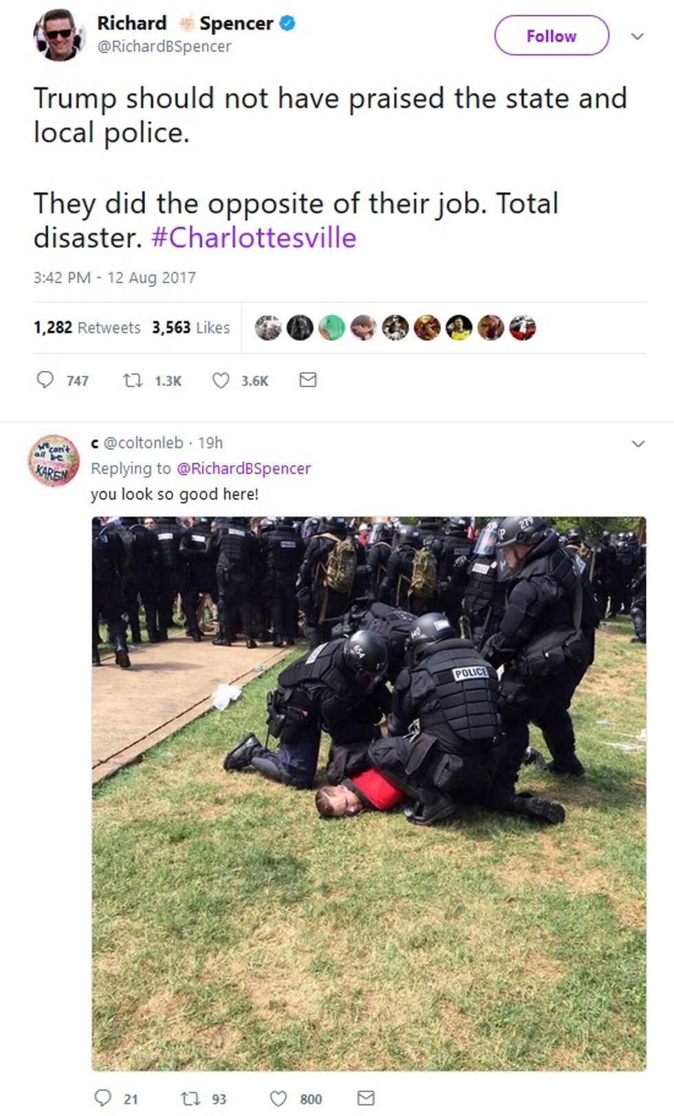 Punchy-faced Richard Spencer had thoughts about all the Police Brutality, against him. We had to include the top reply, too: