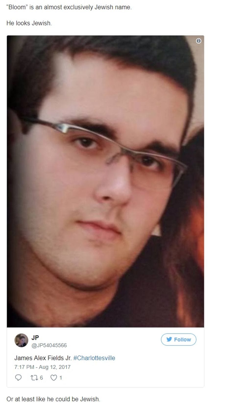 Once the police announced they'd arrested 20-year-old James Alex Fields Jr. and charged him with second-degree murder, The Daily Stormer had a new angle on the attack: The guy couldn't have been a rightwinger because he's probably Jewish. His mother's last name, after all, is "Bloom."