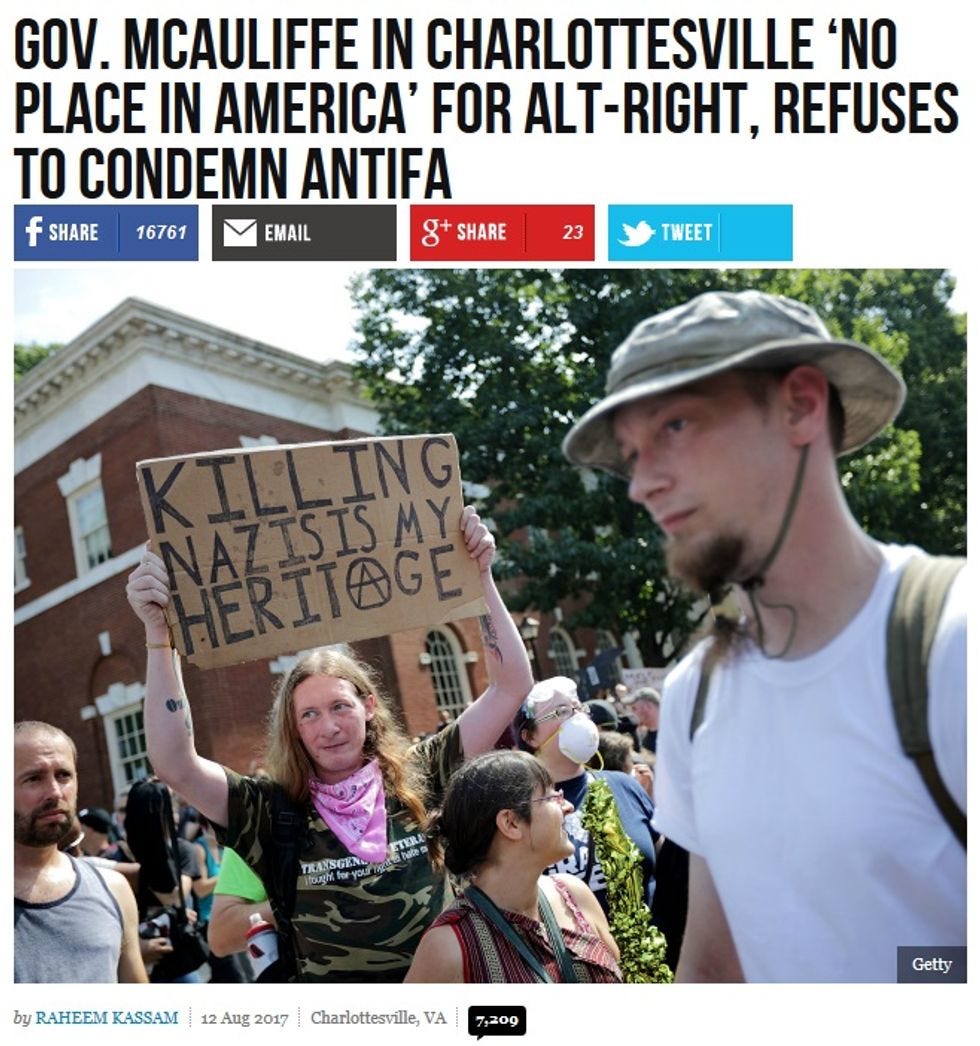 Even worse, McAuliffe refused -- four times! -- to condemn the violent antifa (anti-fascist) demonstrators: