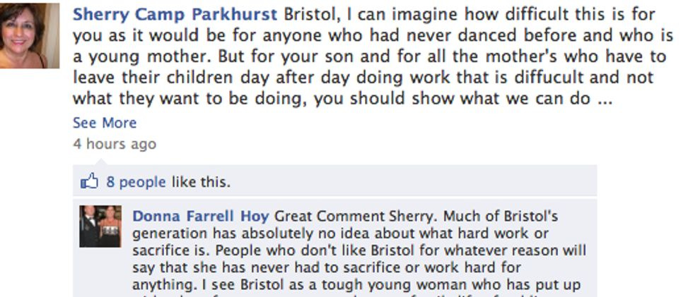 The second comment by Donna Ferrel Hov: <i>"... much of Bristol's generation has absolutely no idea about sacrifice or hard work.</i>