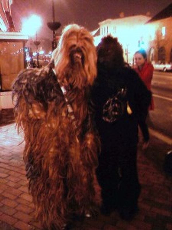 In a startling case of life imitating Blingee, several characters marched straight out of Wonkette's most recent photo contest and onto the streets of Georgetown last night. The fully furred Chewbacca and, uh, we actually aren't sure what that other one is, explained to your intern that they were dressed up for a birthday party.