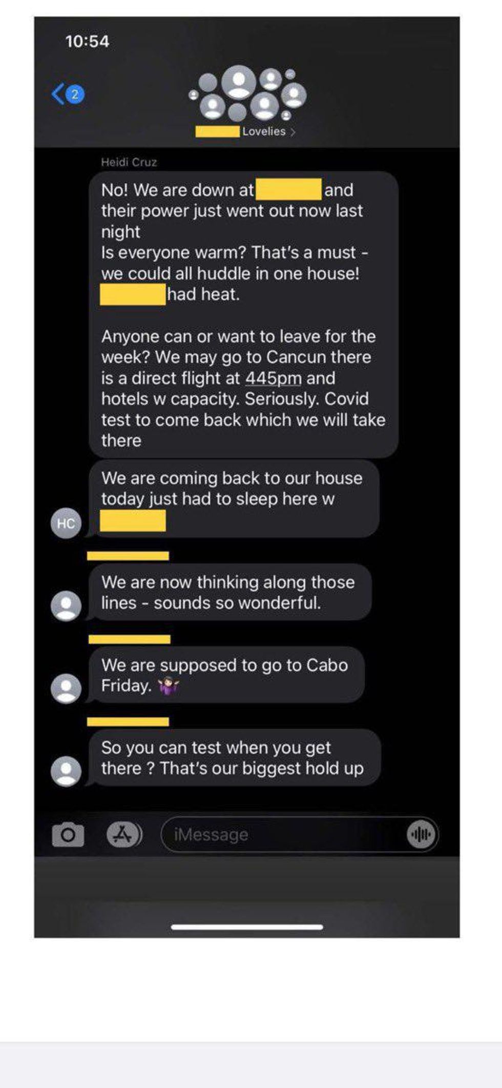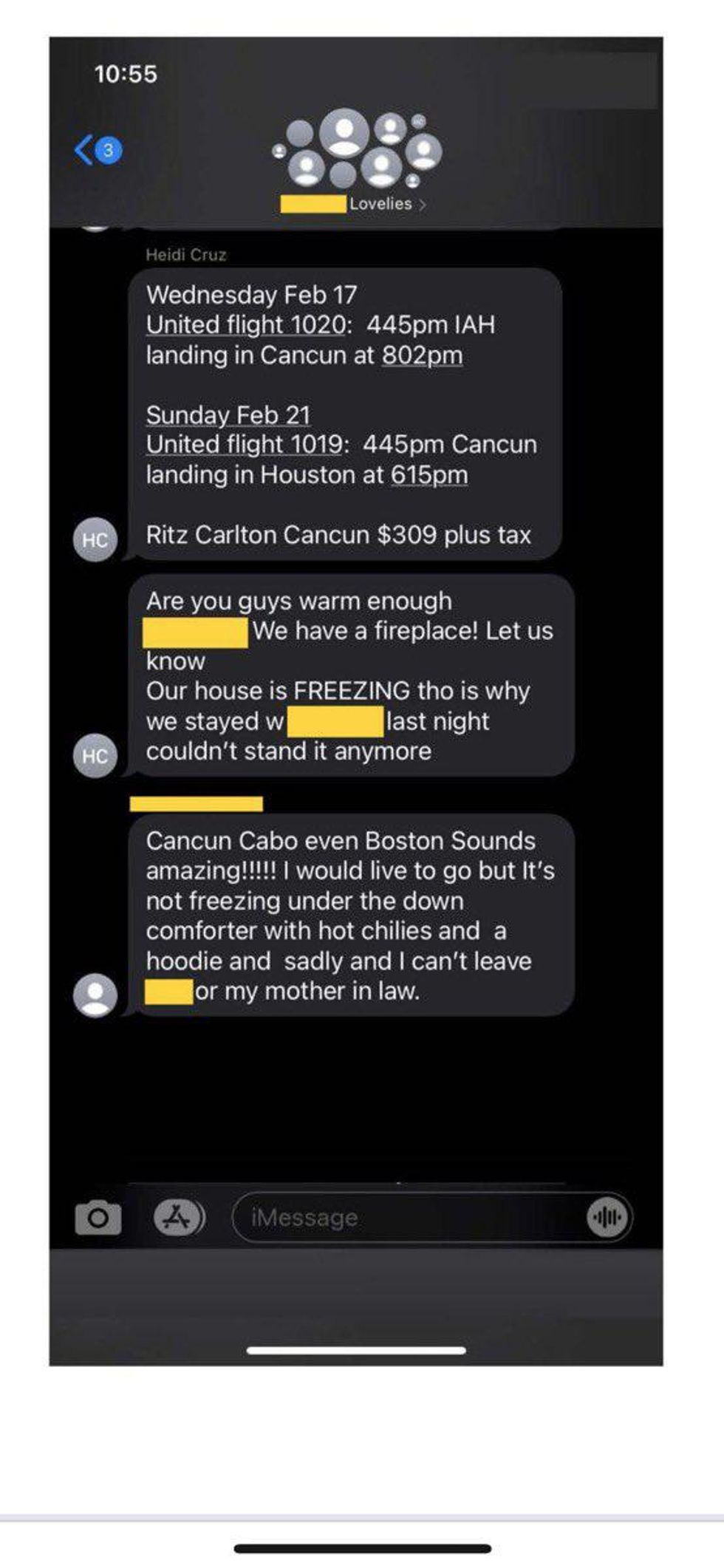 Text messages sent from [Heidi] Cruz to friends and Houston neighbors on Wednesday revealed a hastily planned trip. Their house was "FREEZING," as Ms. Cruz put it — and she proposed a getaway until Sunday. Ms. Cruz invited others to join them at the Ritz-Carlton in Cancún, where they had stayed "many times," noting the room price this week ($309 per night) and its good security. The text messages were provided to The New York Times and confirmed by a second person on the thread, who declined to be identified because of the private nature of the texts.