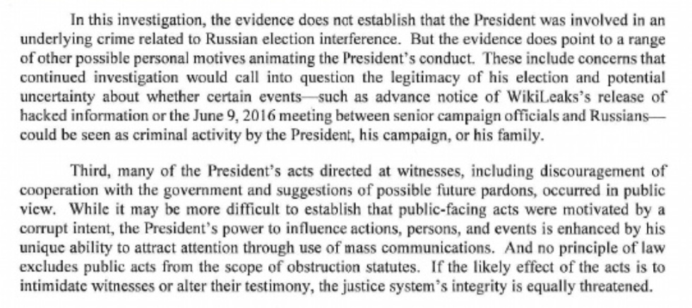 In short, though the investigation "does not establish" Trump committed crimes with election interference (but it doesn't really not establish it either, especially wtih things like HE HAD FOREKNOWLEDGE OF WIKILEAKS RELEASES AND THEY PLANNED CAMPAIGN STRATEGY AROUND IT), the evidence points to a bunch of reasons Trump obstructed justice.