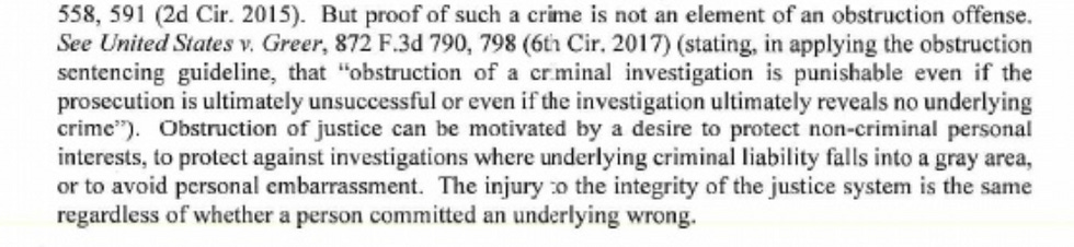 3: 04:In Mueller's analysis of the whole shebang, he explains on page 157 that FUCK YOU BILL BARR, because "proof of ... a crime is not an element of an obstruction offense." He continues: