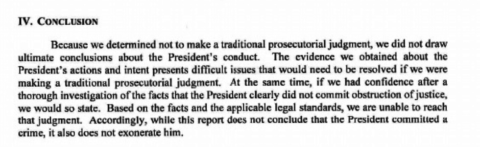 Hey, remember how Robert Mueller didn't make a judgment on that, and didn't want Bill Barr to make one either? He wanted Congress to read this and say "holy fuck there is a criminal in the White House."