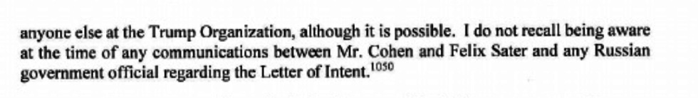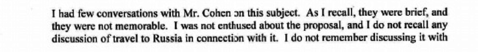 And as we have discussed, he does not recall anything about the Trump Tower Moscow project, which is just a fucking lie.