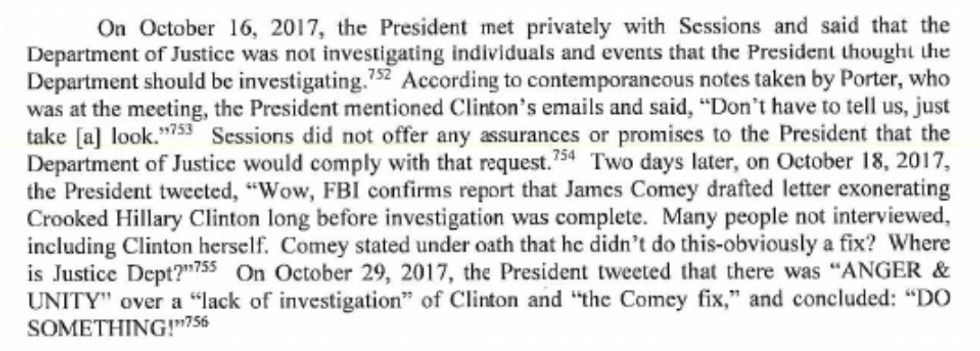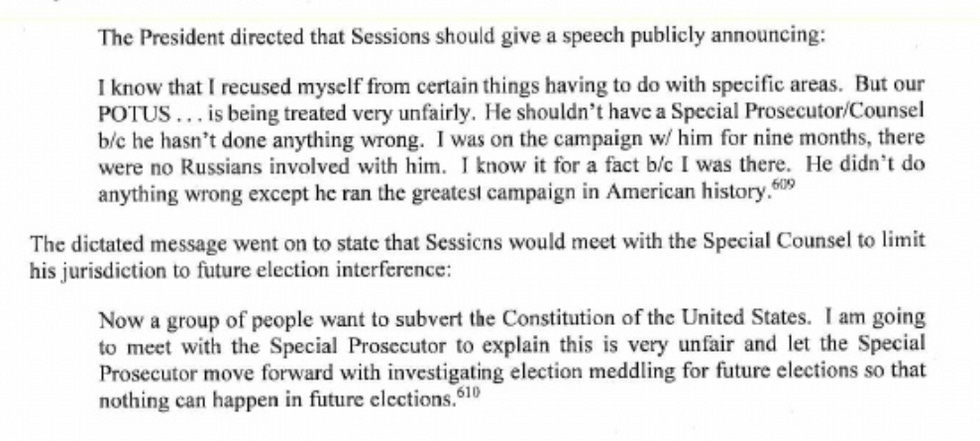 Mueller's conclusion here (p. 113) is that it would be REASONABLE to believe that Trump's campaign (which lasted over a year) to get Jeff Sessions to unrecuse and take control of the Russia investigation was intended so that Sessions could do his dirty work, kill the Russia investigation, and start an actual politically motivated witch hunt into Hillary Clinton and others.