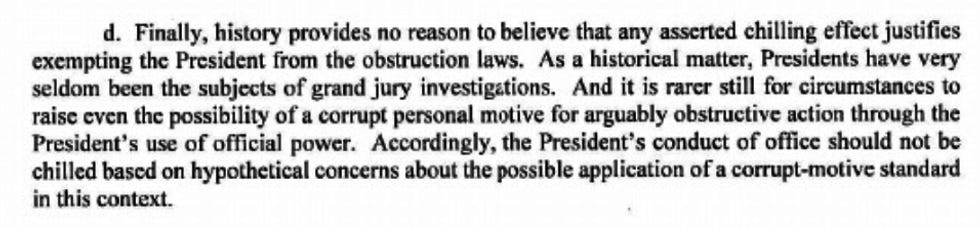 4: 43:As Mueller rounds third base and heads home (p. 180), he notes that there's no reason to think holding Trump accountable for all his rampant obstruction of justice (you know, hypothetically) would have a chilling effect on other presidents, because (he seems to be saying?) OTHER PRESIDENTS AREN'T LAWLESS FUCKWEASELS LIKE DONALD TRUMP: