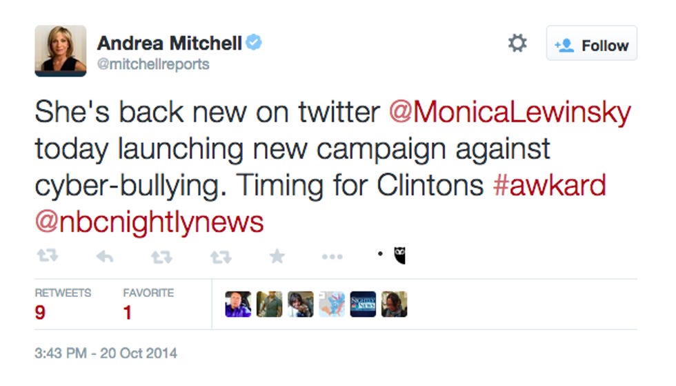What exactly is Andrea Mitchell trying to accomplish? Perhaps the former first ladyandsenatorandsecretary of stateandpotentially future president will be baited into some sort of Twitter fight? Or perhaps she'll simply be so overwhelmed by the mere existence of Monica Lewinsky -- ON THE INTERNET -- that she'll go into permanent seclusion, abandon any plans she might have had about running for office again, and eat all the Häagen-Dazs while she tearfully sings "I Will Survive"? This, finally, Monica Lewinsky's presence on Twitter, will be her undoing?
