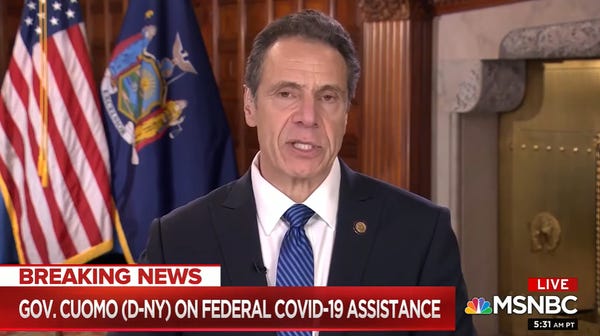 Cuomo went on all the TV chat shows this morning before his daily presidential press conference, the daily press conference that actually makes people feel better, even when the news is bad, because at least somebody is paying attention. On "Morning Joe," Cuomo said nobody in their right damn mind should be watching Trump's daily corona-lingus pressers, and that if it wasn't literally a matter of life and death, it would be funny, like a common "Saturday Night Live."