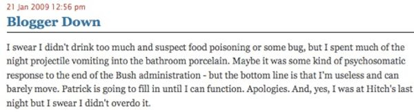 Here it is, the ultimate Andrew Sullivan "Daily Dish," about vomiting inChristopher Hitchens' bathroom, which is, of course, symbolic. Thanks to Serolf Divad for sharing. [ Andrew Sullivan ]