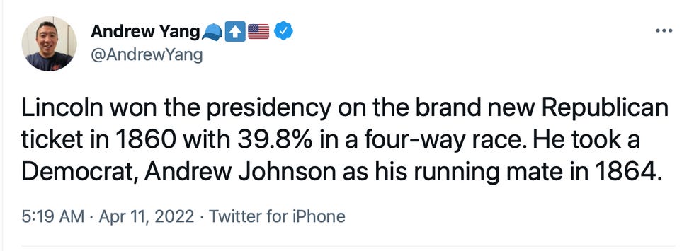 Andrew Yang, a failed presidential and mayoral candidate, has opinions about politics. Specifically, he thinks the nation’s political parties are too divided and what we need is more unity with the fascist death cult. Monday, Yang tweeted this aspirational message from his "history trivia of the day” calendar: