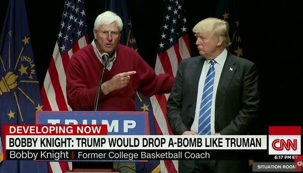A day after Donald Trump proved his mastery of Foreign Policy, former Indiana basketball coach Bobby Knight offered his own foreign policy genius to the Trump campaign. In a speech Thursday in Evansville, Indiana, Knight introduced Trump as having the potential to be another great president like Harry Truman since he's got the guts to "drop the Bomb." It was a huge hit with the crowd, even if elitist snobs insisted on pointing out that a lot of what Knight said was a potent mix of incorrect history and pure bollocks. (And also terrifying.) Said Knight, sounding exactly like your idiot uncle who's got three "MAKE AMERICA GREAT AGAIN" hats,