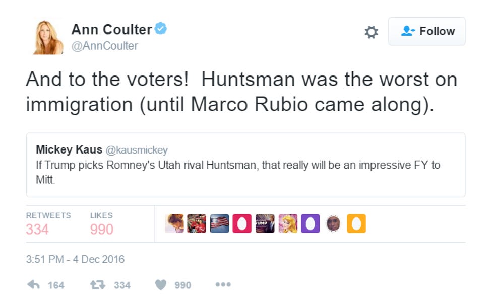 She was still sad on Sunday, responding to a rumor that former Utah Gov. Jon Huntsman may now be on Trump's list for secretary of State. She was also still retweeting Mickey Kaus: