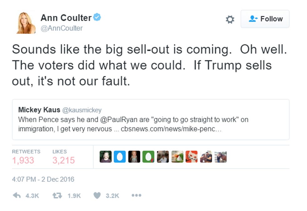 LIFELIKE APPROXIMATION OF HUMAN TEARS! That is what Ann Coulter is doing about the article Mickey Kaus tweeted, where Mike Pence says he's going to work with Congress on immigration, all quick-like, but which also mentions how Speaker Paul Ryan has said Trump's little thing about immediately deporting 11 million people ain't gonna happen. Trump's gonna sell out! He's not going to Holocaust OR deport all the brown people, and that was literally the only thing Ann Coulter wanted for Christmas.