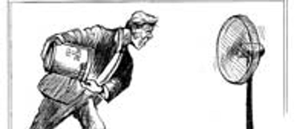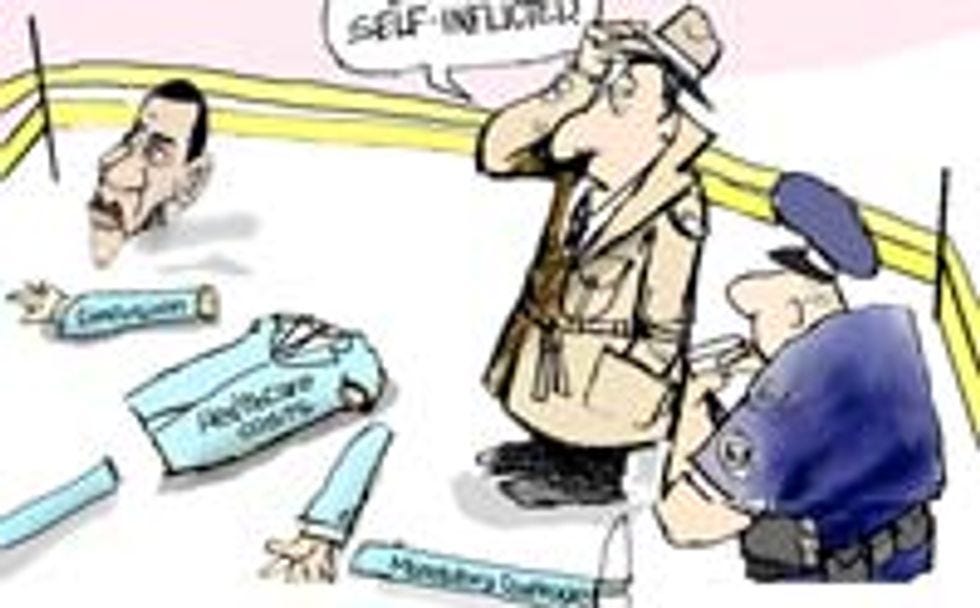 This bill will in fact be an actual bucket full of human waste, presumably all liquid and soupy, the better to splatter everywhere when tossed into a fan, which is what Max Baucus plans to do with it, at least according to Jeff Danzinger, who, you will recall , is America's Greatest Living Cartoonist Drawing True Things That Will Turn Your Stomach.