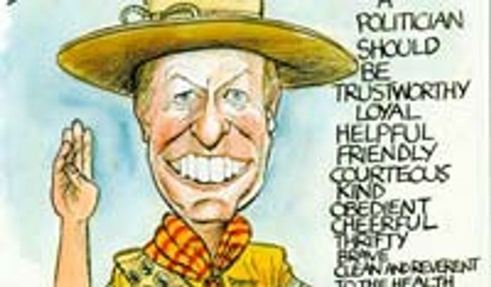 Like that Max Baucus! He's got the right idea! After weeks and weeks and weeks of trying to woo Chuck Grassley and Mike Enzi with his so-called "thoughts" and "ideas," he finally broke down and started talking in the language they understood: the language of pederasty fantasy role-play. "Gosh, Senators, I'm just a tenderfoot scout glad to be here at the Senate to earn my Civics badge ... oh, it's traditional in Senate offices not to wear any pants? Well, OK, if you say so ... OH MY GOD!" Later, once they're enjoying their post-coital afterglow, he can convince them to sign whatever half-assed compromise bill he's cooked up.