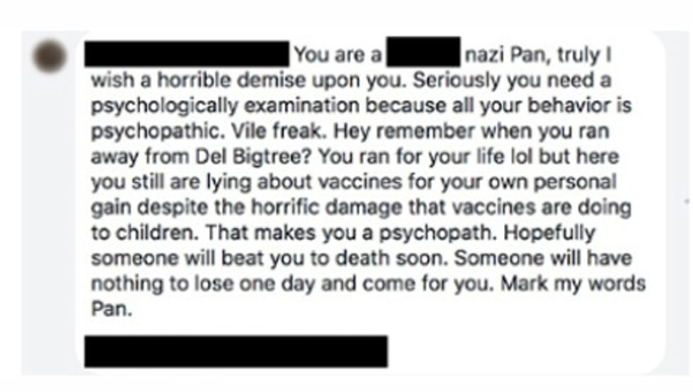 When a child dies, members of the group sometimes encourage each other to go on that parent's Facebook page. The anti-vaxers then post messages telling the parents they're lying and their child never existed, or that the parent murdered them, or that vaccines killed the child, or some combination of all of those.