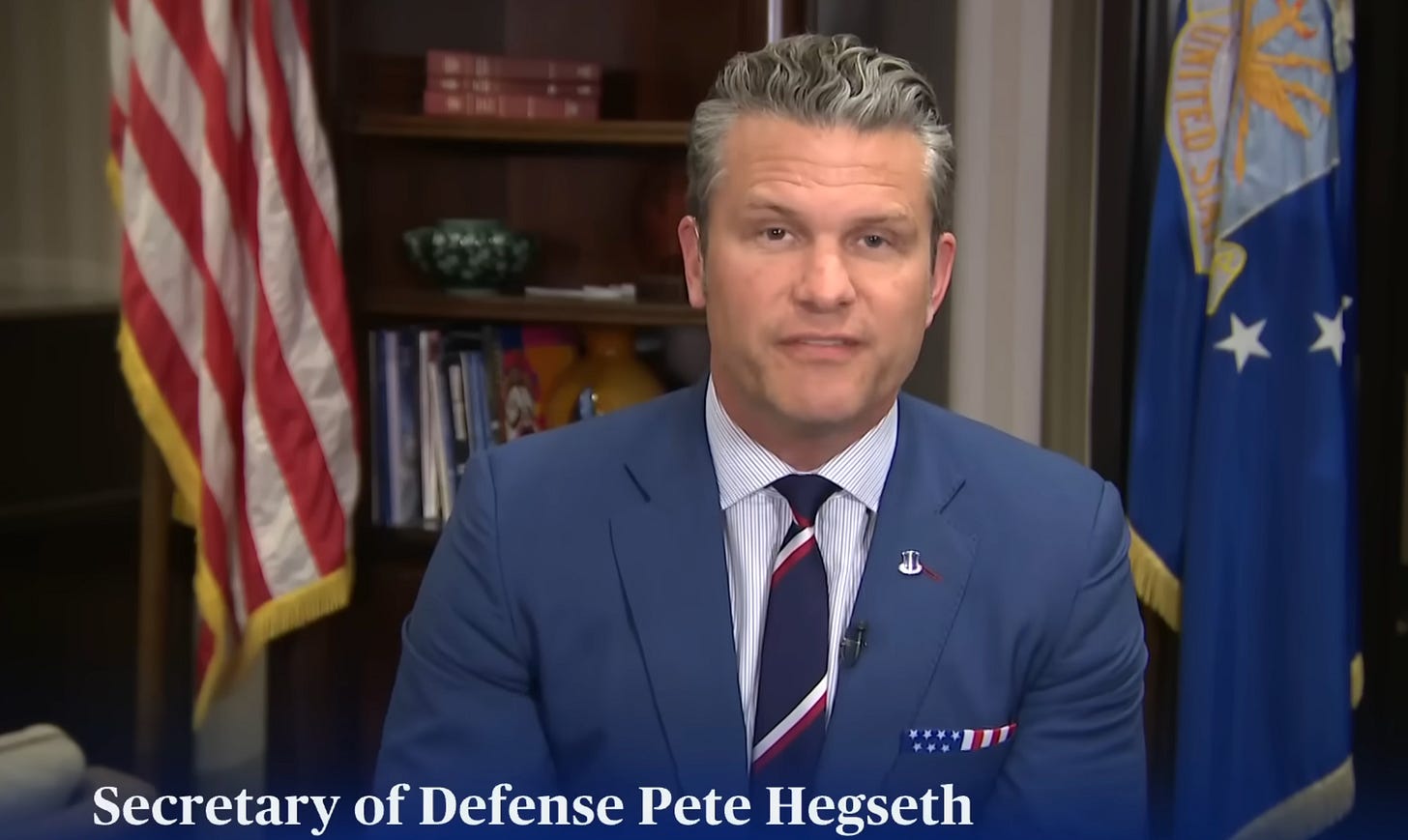 But yet he does that while, every few sentences, inserting a phrase that tickles the balls of Hegseth’s insecurities and makes him feel safe. “Department of WAR,” because Pete Hegseth feels like more of a man if he can be the secretary of WAR, because “defense” is for pussies, and you know who is not a pussy? The Secretary of WAR!