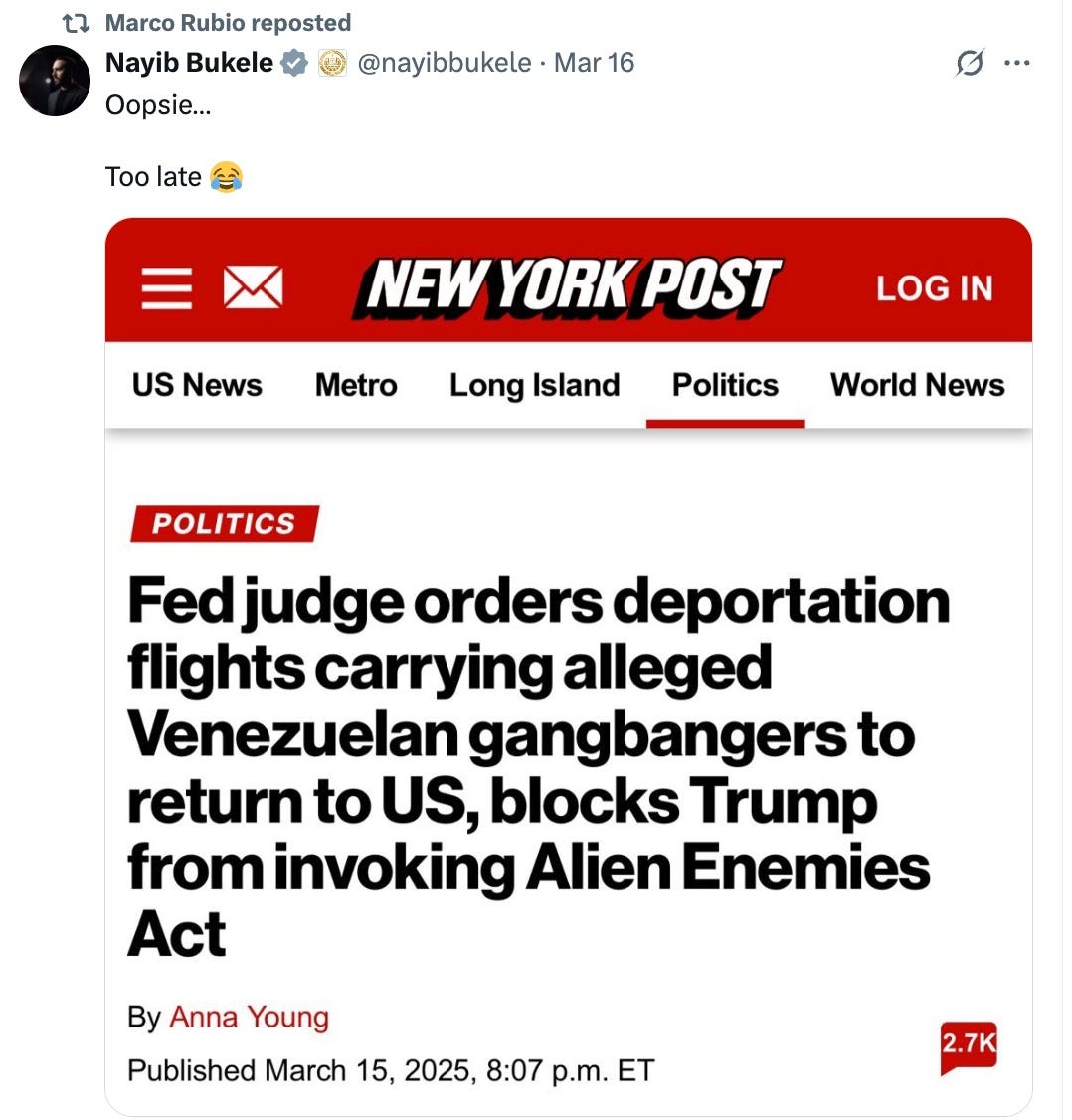 Right after Axios’s story came out, Trump press secretary and angry pile of pancake makeup Karoline Leavitt issued a denial: “The Administration did not 'refuse to comply' with a court order. The order, which had no lawful basis, was issued after terrorist TdA aliens had already been removed from U.S. territory.”