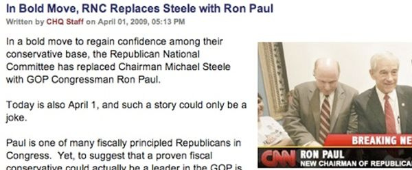 You know what sucks? April Fools crap on news websites. You know what wouldn't suck at all? If Doktor Ron Paul became the one true chairman of the Republican National Committee. Oh, the laughs! Oh, the costumes! Oh, the love (spelled backwards, on a blimp). Sadly, this didn't happen, and it will never happen -- but not because Ron Paul is a nut, and not specifically because his remaining followers are all actual hobbits. It's because Republicanshate Ron Paul's guts. They would sooner appoint Cynthia McKinney as RNC chairman. [ Conservative HQ ]