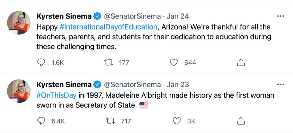 After all, where is the Senate’s most useless Democrat? She’s at home washing her tights tweeting out random factoids as democracy collapses in her backyard. No speeches on the Senate floor about how Republicans in her own state are making it harder for her constituents to vote. That apparently isn’t self-serving enough. However, she’ll let Arizonans know its National Blood Donor Month or International Day of Education. She’s not much of a senator but she’s a great “On This Day” calendar.