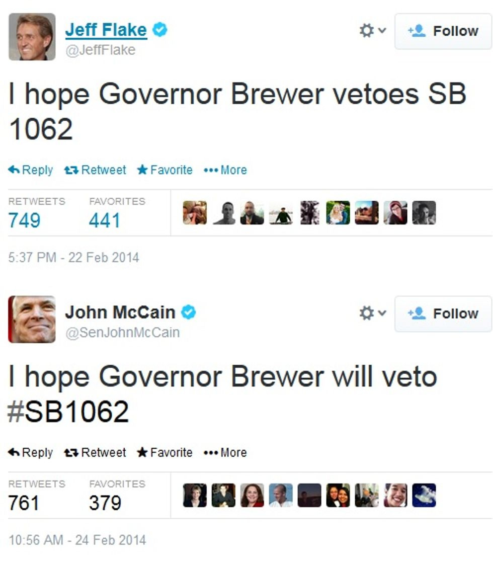 she'll veto the bill. Jan is certainly not the sharpest knife in the drawer but she knows which side her bread is buttered on- the business community is pissed about this bill and they are letting her know in no uncertain terms. far too much of our economy is based upon tourism and the convention business and the people who make their living in this area are still recovering from the SB1070 fiasco (and unlike the braindead GOP true believers, they can still remember the MLK fiasco and don't want a repeat with the 2015 Superbowl). Brewer won't do the right thing for the right reason, but there is too much money at stake for that greedy old bag to sign.