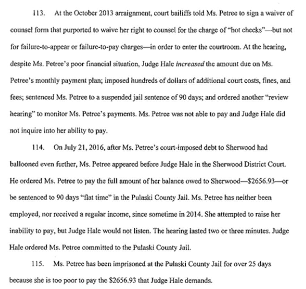 Now, Robertson is one of the plaintiffs in a class action suit in federal court being pursued by the Lawyers’ Committee for Civil Rights Under Law and the Arkansas Civil Liberties Union, claiming the city of Sherwood is running what is in effect a "modern-day debtors' prison" similar to the scam run by the courts in Ferguson, Missouri. That delightful operation was investigated by the Justice Department, eventually forcing all municipal court cases to be reassigned to circuit courts and resulting in the resignation of a scumbag judge who -- so ironical! -- failed to pay his own taxes.