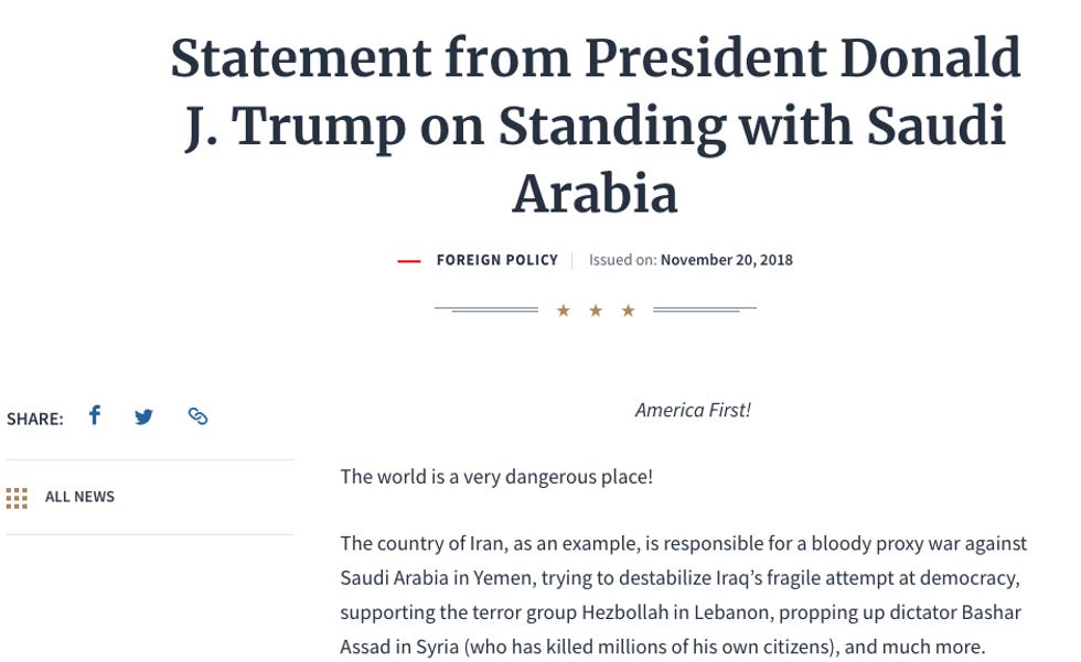 Whichever staffer gets deputized to edit the loony out of official statements has clearly gone home for Thanksgiving already. Feel free to read the whole thing yourself -- it is CRAY-ZEEEEE! But to summarize, Iran BAD, Saudi Arabia GOOD, Murder BAD, Arms Sales GOOD.