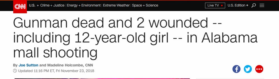 Hoover police originally "suggested" that Bradford had gotten into a fight with an 18-year-old and shot him multiple times. The victim was hospitalized, along with a 12-year-old girl who was caught in the crossfire. Later the next day, after completing their Black Friday shopping, the police "retracted" the statement, admitting they didn't know who the hell had shot the victim but it probably wasn't Bradford. Sleep well, Birmingham, the actual shooter is still at large! By the way, this is still a live headline on CNN.com: