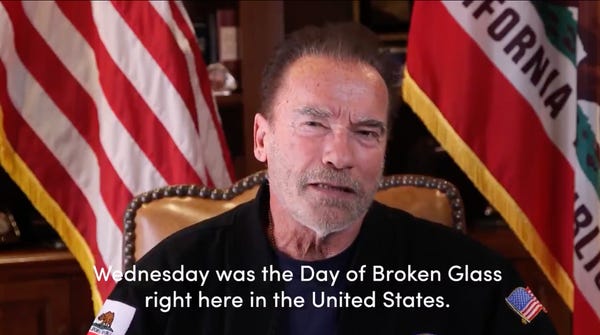 This morning, action star and former California Governor Arnold Schwarzenegger shared a video on Twitter condemning the actions of those who stormed the Capitol last Wednesday, comparing it to Kristallnacht, or the night of broken glass, when Germans, led by Nazi storm troopers, started demolishing Jewish businesses and homes and synagogues.