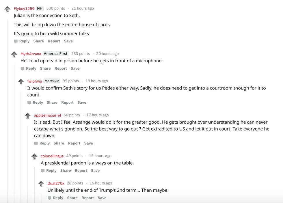 The gist of it is that Trump's DOJ is going to prosecute Assange, but only so that he can prove once and for all that Seth Rich is the one who leaked the hacked DNC documents to Assange (he was not) and that his murder was not a regular murder, but rather a murder orchestrated by Hillary Clinton herself.