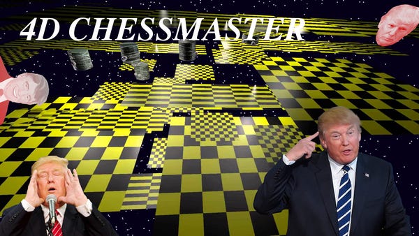 While not all Trump supporters are into the whole QAnon thing, this kind of mindset is breathtakingly common throughout the general Trumposphere. Many an ardent supporter has been banned from r/The_Donald for questioning the wisdom behind anything their "God Emperor" does. It is simply not allowed. While there are certainly exceptions to this rule, there is a strong subset of supporters willing to twist themselves into knots in order to find a way to rationalize anything he does, says or believes. There must always be a reason, a higher purpose, a thing he is doing that they are not smart enough to understand because he is a genius and they are not.