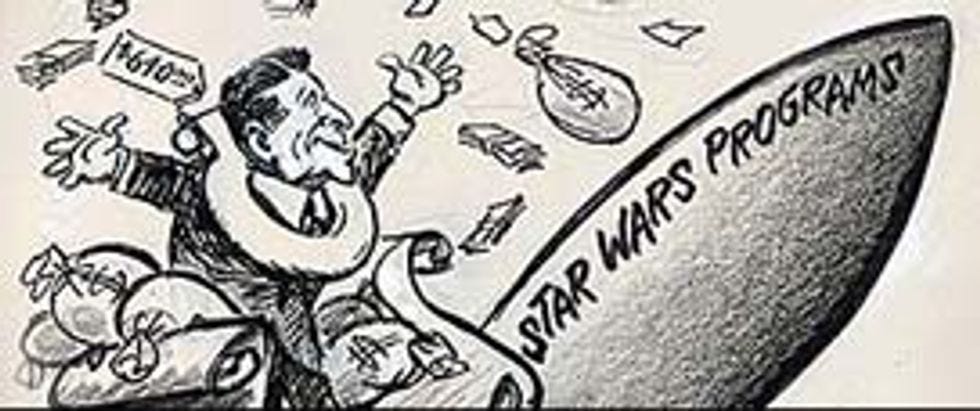 MUSEUM-GOING OPPORTUNITY!Unemployed Washingtonians, once you've picked all the meat off of the dead hands of tax-paying Americans, what are you going to do with your copious free time? Perhaps you should go see an exhibit at the Library of Congress, about political cartoons! Specifically, there's a big display of Herblock cartoons over at the South Gallery on the 2nd Floor of the Thomas Jefferson Building, which we think ... is in Washington, DC, maybe? Anyway, it covers the beloved cartoonist's staggering 72-year career, featuring many cartoons from many eras, including the one below ofRonald ReaganCaspar Weinberger (CORRECTED: Sorry, your Comics Curmudgeon is too young to remember the mythical "Reagan era" very clearly) riding a giant space-dildo. Enjoy!