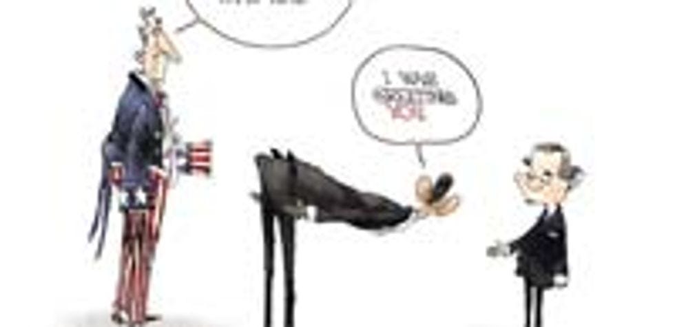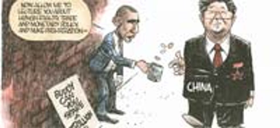 Defeated in all his efforts, Obama was forced to beg for change like a common hobo. And who came by to drop a little change in his begging cup but the Red Chinese? Yep, they're just strolling along, with their hand ... protruding ... from the side of their torso ... oh my God, is that somebody else's severed hand? Have the Chinese leaders become so megalomaniacal that they're too good to throw change at us with their own hands, which must remain unsullied by such base activities, and thus they're using the dismembered limbs of political prisoners or Tibetan monks to do it? Monsters! At least we'd never see such barbaric practices here in America!