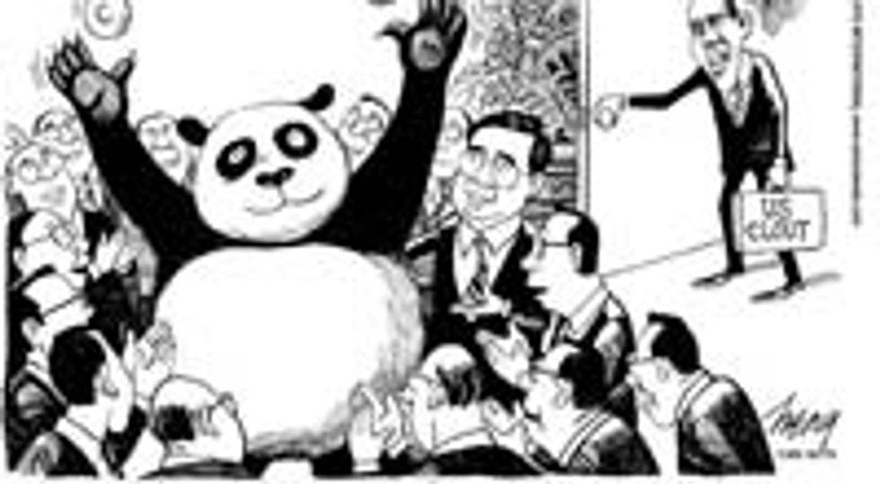 Now hated by all Americans, Obama headed overseas. At least the Foreigns still like him, right? Didn't they just give him that lovely Foreign Peace Prize? Surely, he thought, I'll get to Asia-land or whatever and they'll be slobbering all over me, just like old times! Well, guess what, Mr. Sexy President? You're all sexy and cute and lovable and what not, but can you compete with ... an adorable panda bear? Of course you can't! Nobody can! And that's why Obama's recent Asian summit ended with absolutely no love for the Prez, but with a multilateral agreement to ship millions of tons of bamboo a year tariff-free to the Panda Kingdom. DAMN YOU, PANDA!