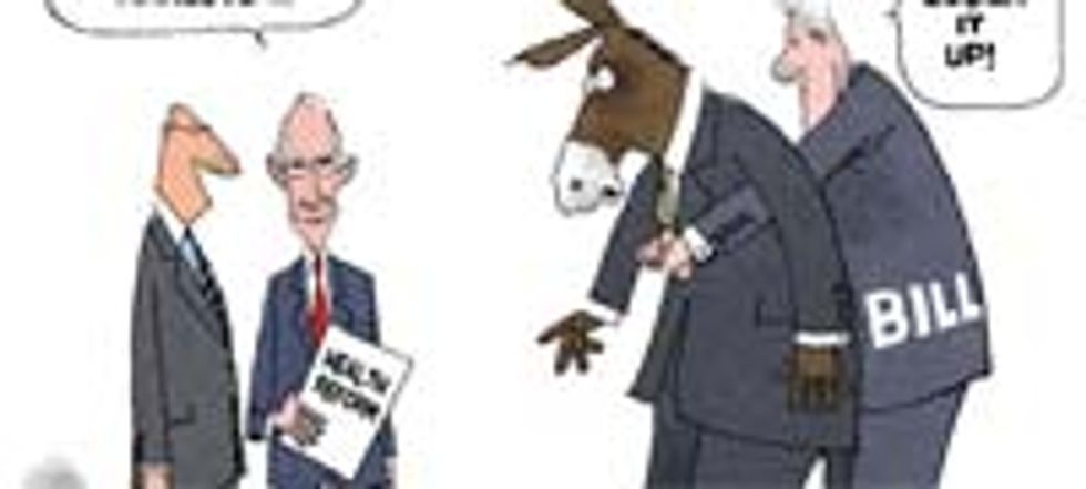 The relationship between Bill Clinton and the Democratic Party is a complicated one! Many Americans were kind of sick of him after eight years, and you could argue that his many Problems and Failures resulted in George W. Bush's election, and his behavior during the 2008 campaign did not endear him to anyone in Obama's inner circle. Nevertheless, he is a huge figure in the party, the only post-World War II Democrat to be elected twice. He is the Big Dog! He gets things done! And Harry Reid knows that sometimes, if you've got a really big job ahead of you, like passing health care, you've gotta call him down to the Capitol and have him ass-rape a donkey. It's kind of unsavory, but if you know a way to get wavering conservative Democrats into line that's better than a little ex-President/donkey sodomy, I'd sure like to hear it.