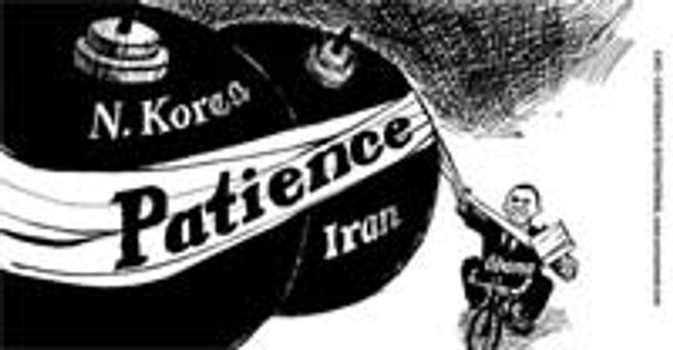 Rebuffed in his attempts at butt-oriented romance, Obama decides that if he can't do it, nobody can. That's why he hopped onto his tiny Baracycle and is wrapping up the twin butt-cheeks of Iran and North Korea! The combined ass of these two rogue states won't be hanging out for all to see anymore, no sir! Or maybe they're breasts? Hard to say. The point is, nobody's getting any, by cracky.