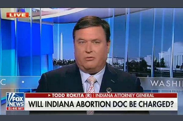 Dr. Caitlin Bernard, the Indianapolis OB-GYN who helped a 10-year-old rape victim get an abortion after the girl was unable to in her home state of Ohio, received notice yesterday that she's under investigation by Indiana Attorney General Todd Rokita, although what the hell he's investigating is anyone's guess. Bernard, who practices medicine at Indiana University Health and is an assistant professor in the medical school, has been the subject of rightwing media attacks ever since the story started getting national attention earlier this month, when she told the Indianapolis Star that a colleague in Ohio had referred a 10-year-old patient to her once Ohio's abortion ban went into effect. The Ohio law has no exceptions for rape or incest.