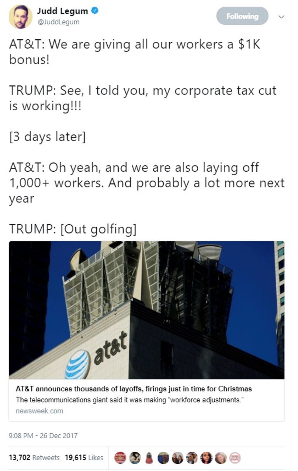 We said it was bullshit then, and of course it was: By Friday, AT&T, which had proudly trumpeted the $1000 bonuses it was handing out to 200,000 employees, also let it be known -- far more quietly -- that thousands of workers were also going to get the axe. Six hundred workers in the Midwest got layoff notices because their jobs were in "landline and other legacy services" -- although AT&T at least said it would try to find them work in other parts of the company, maybe. Even before the tax bill, the conglomerate whacked some 700 DirecTV installers: