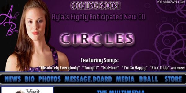 Ayla Brown, as a full 75% of Americans probably know, made it into like the final 100 on a recent season of theAmerican Idol.Now she mostly shares her voice through this fixer-uppered Geocities/MySpace purple monster on the Internet. Her voice is THAT OF AN ANGEL! Too bad she sings in that annoying way that the kids these days love so much, all uppy and downy and labored... anyway now she will be rich, since every Teabagger will purchase each of her self-released albums.