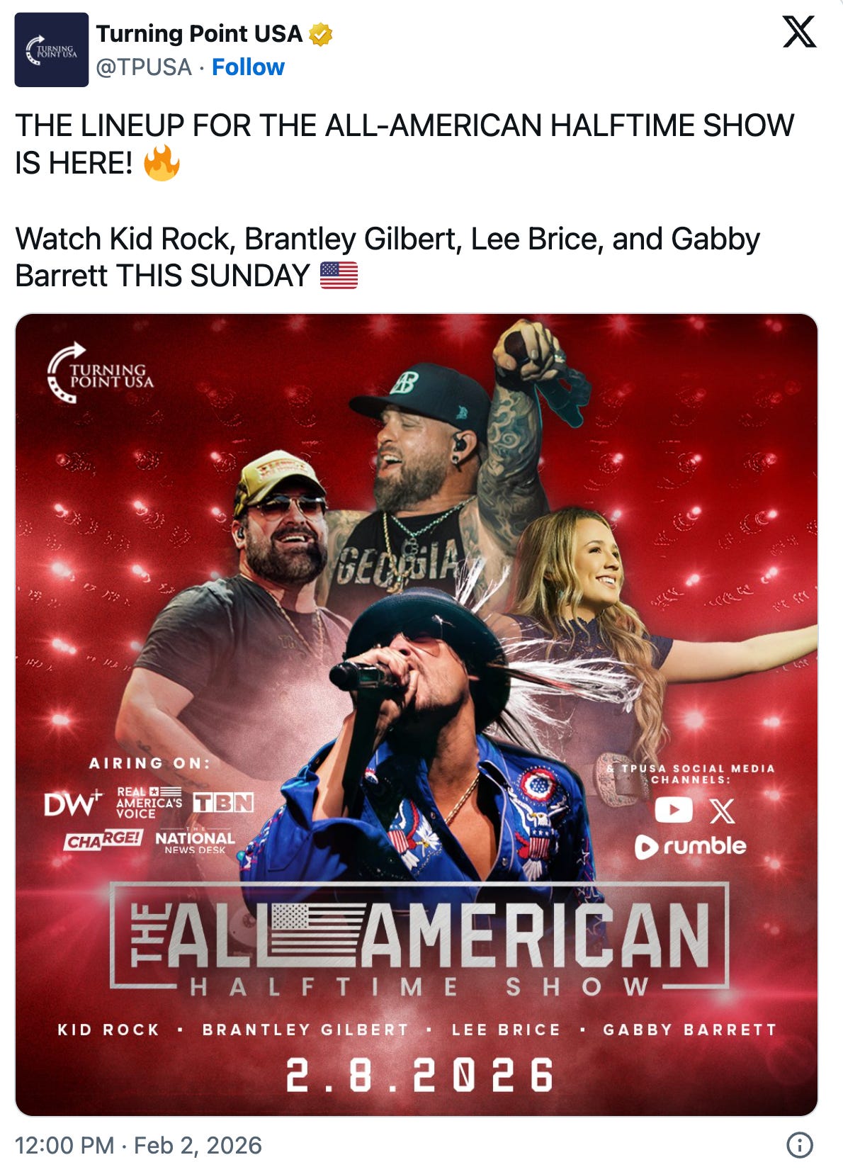 “Turning point has mega stars for half time show I’m watching that my kids are watching that”