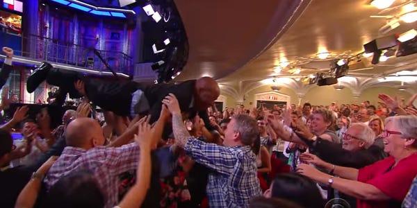 We like to end our days with fun little Nice Time things, so you can chit-chat with each other until way past bedtime in the comments, like you always do. And you may have seen this wonderful video in this morning's Wonkagenda, but if you were still snoozing and didn't see it, that is OK because Civil Rights hero Rep. John Lewis crowd-surfing on the Stephen Colbert Late Night Giggles Hour is awesome enough to get its own post.