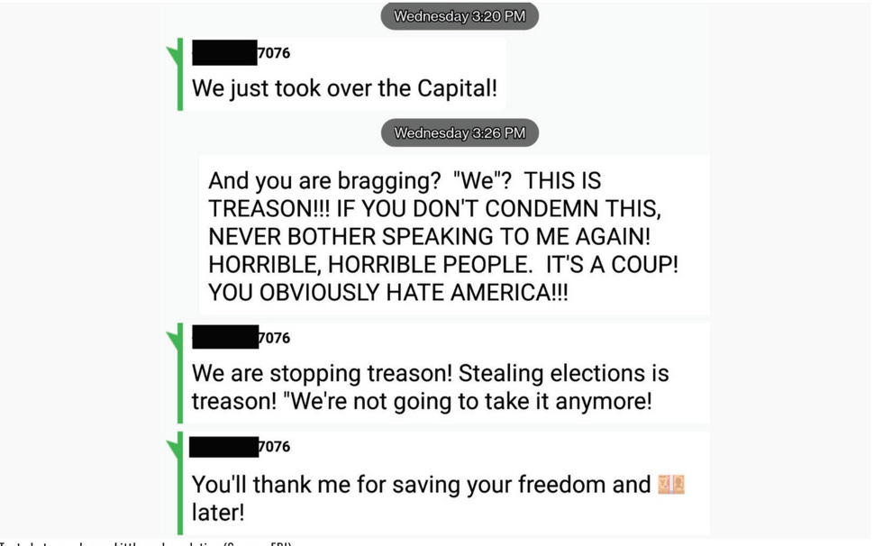 During the riots, James "Les" Little of Claremont, North Carolina, excitedly texted a relative, "We just took over the Capital! [sic]" and "We're stopping treason! Stealing elections is treason! We're not going to take it anymore!" and "You'll thank me for saving your freedom and [some kind of emoji I do not recognize] later!"