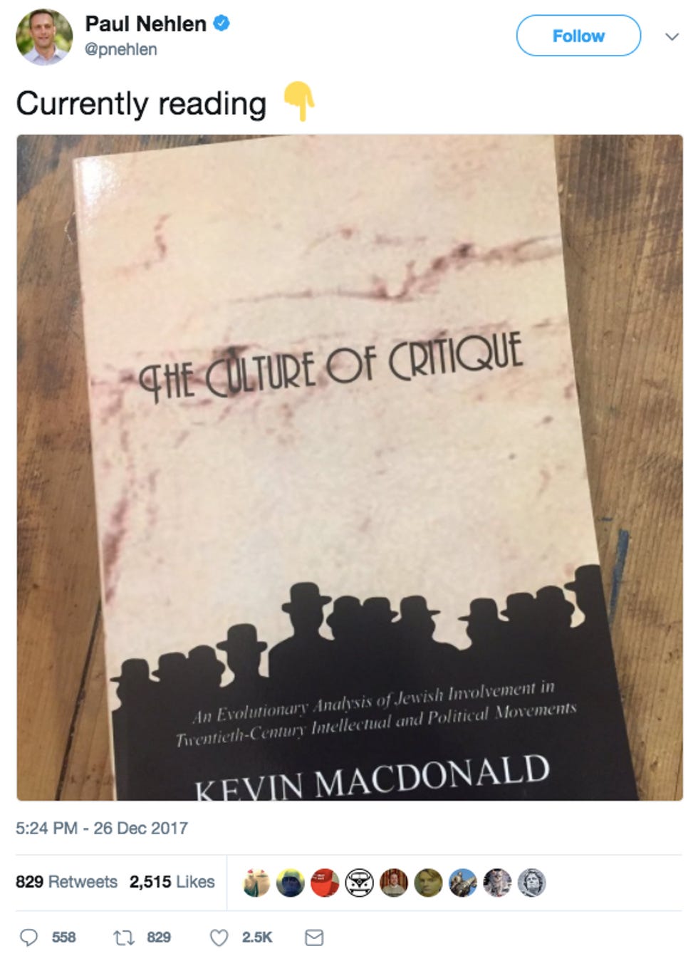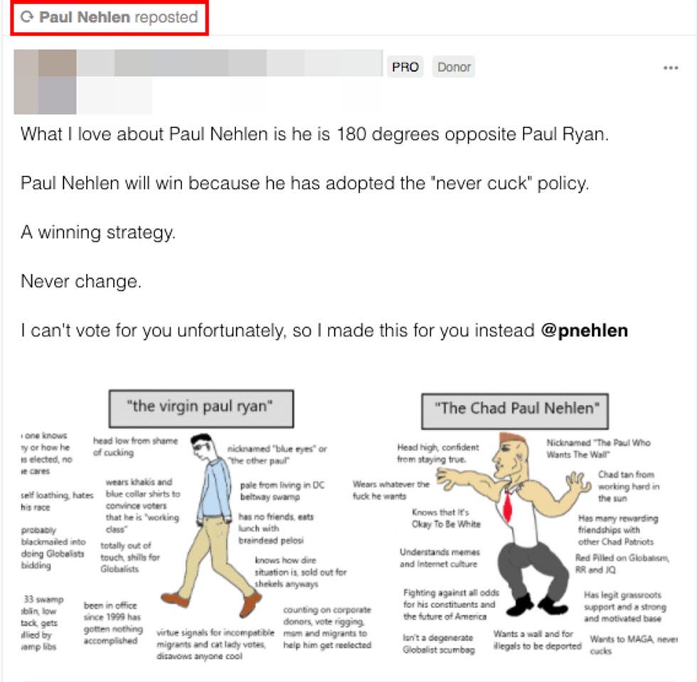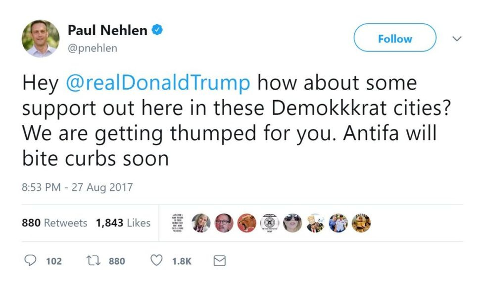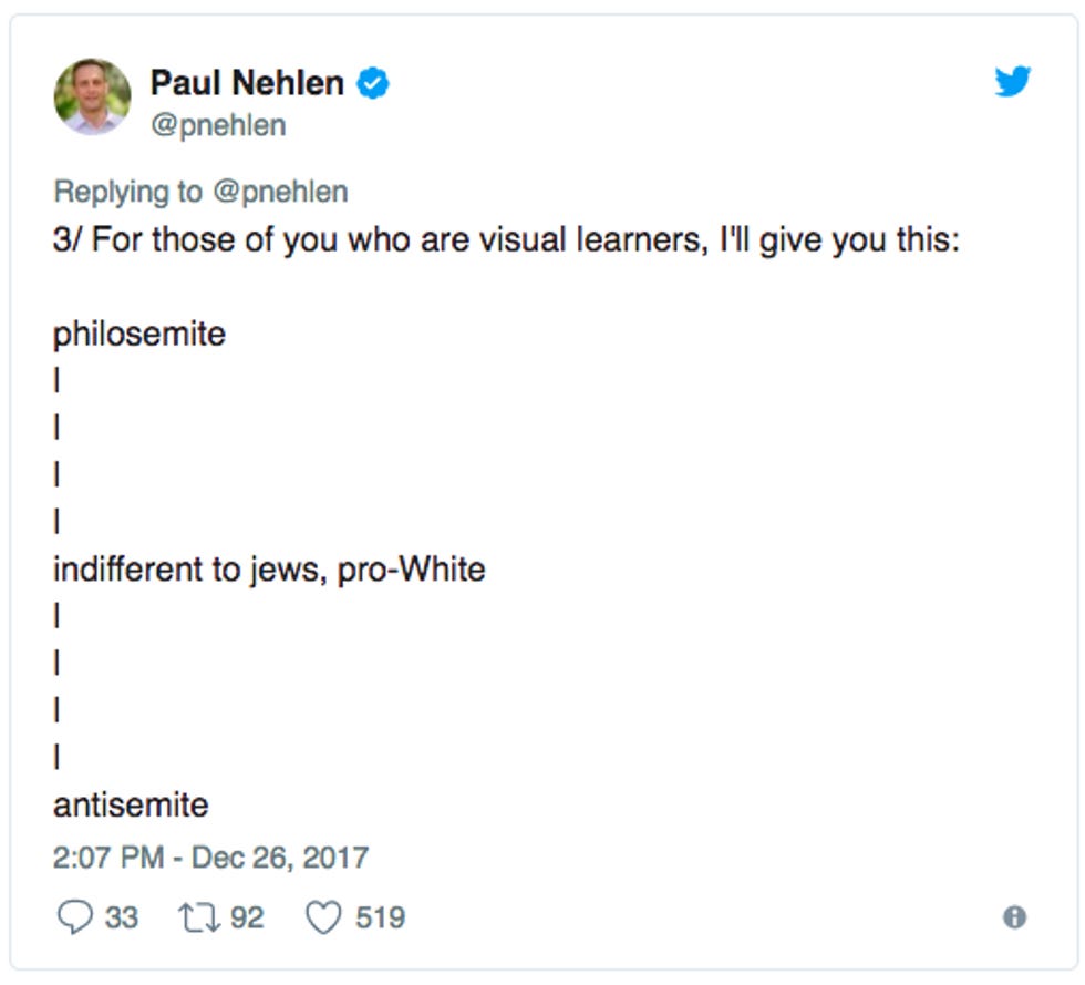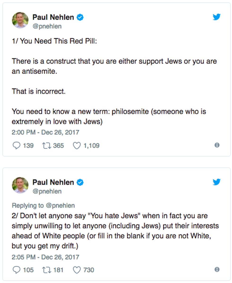 Ain't he a peach! Nehlen is your standard issue neo-Nazi in a tie. He loves Jesus and guns, hates Muslims, and knows Jews aren't white. He's a Red Pill dipshit who retweets "Chad" memes and thinks Antifa is a real thing. You know, A MORON.