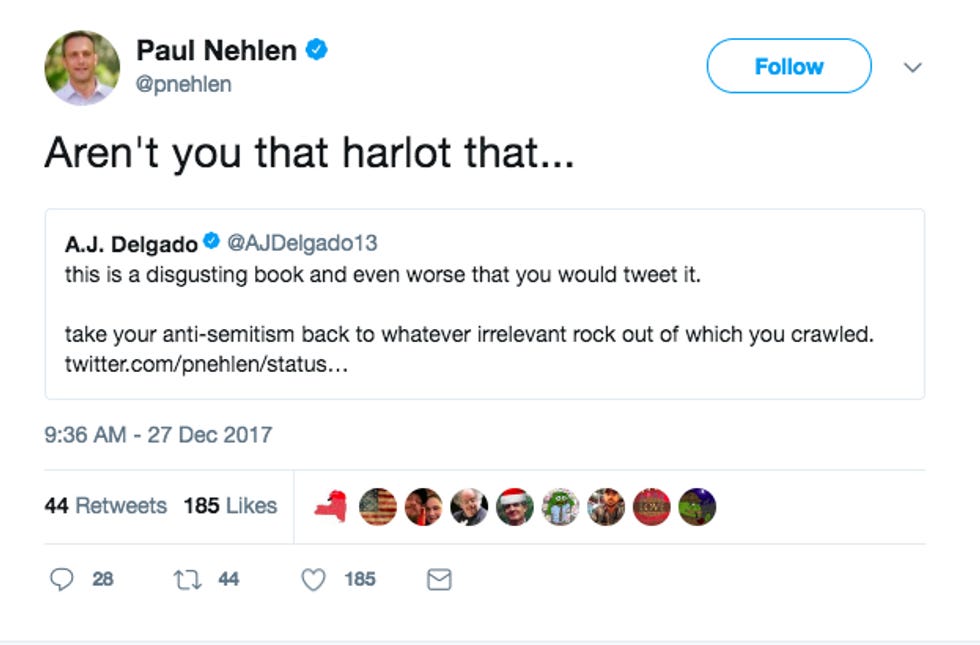 Not to get too technical, but Nehlen is a fucking lunatic. If Ryan really does retire, then this Hitler Youth reject may actually replicate Roy Moore's Montgomery Miracle and turn Wisconsin's First Congressional District blue. He's just that crazy! Whether it's telling John Podhoretz to "eat a bullet,"accusing John Cardillo of shilling for"sheckles" [sic, and teehee], or joking about a good, old fashioned curb-stomping, Nehlen has what it takes to turn a safe red seat blue.